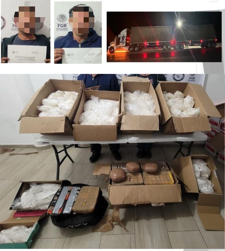 Elementos de la Fiscalía General de la República (FGR) detuvieron a Gonzalo “N” y Daniel “N”, por transportar narcóticos ocultos en los semirremolques de un vehículo tipo tractocamión marca Kenworth, modelo 2019. En el interior se localizaron 110 kilos de metanfetamina, distribuidos en 173 bolsas y 32 recipientes de plástico, así como tres kilos de goma de opio contenidos en tres paquetes.